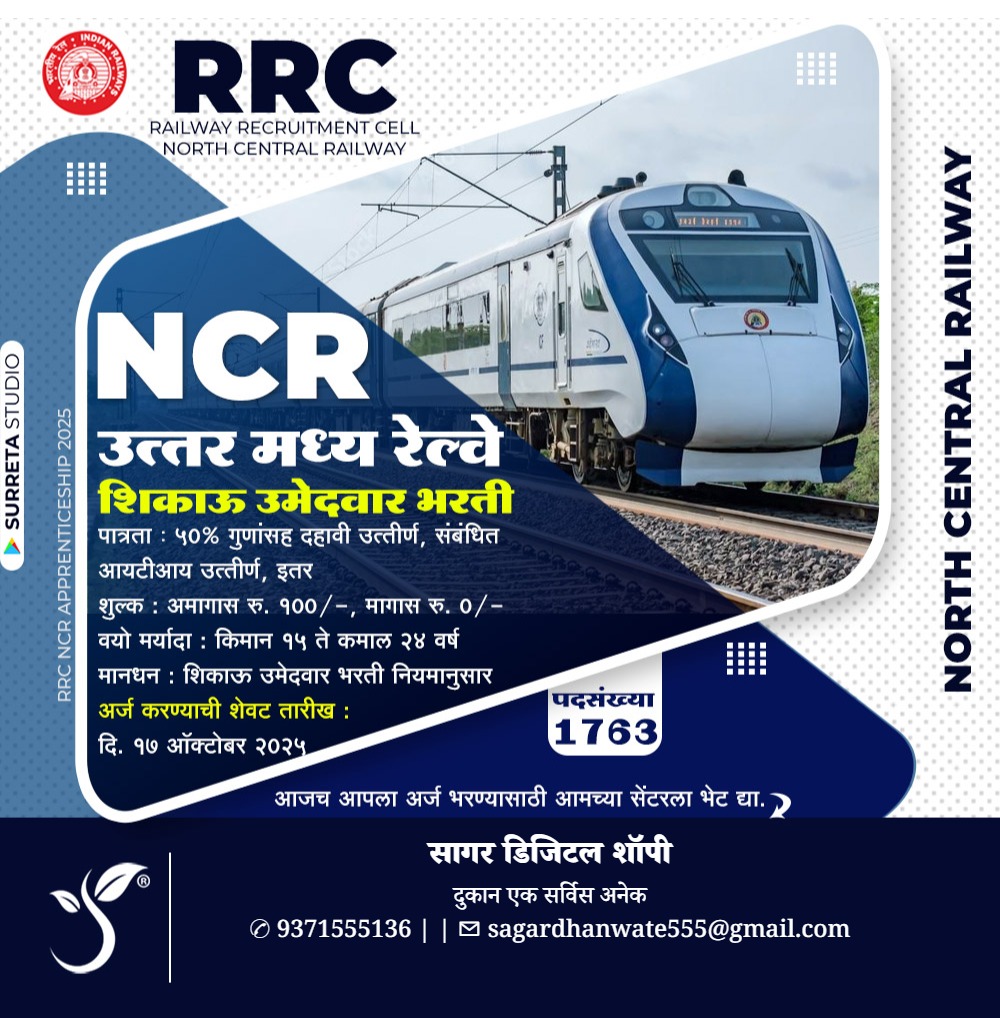 ☑ *उत्तर मध्य रेल्वे मध्ये शिकाऊ उमेदवार पदाच्या १७६३ जागा*
