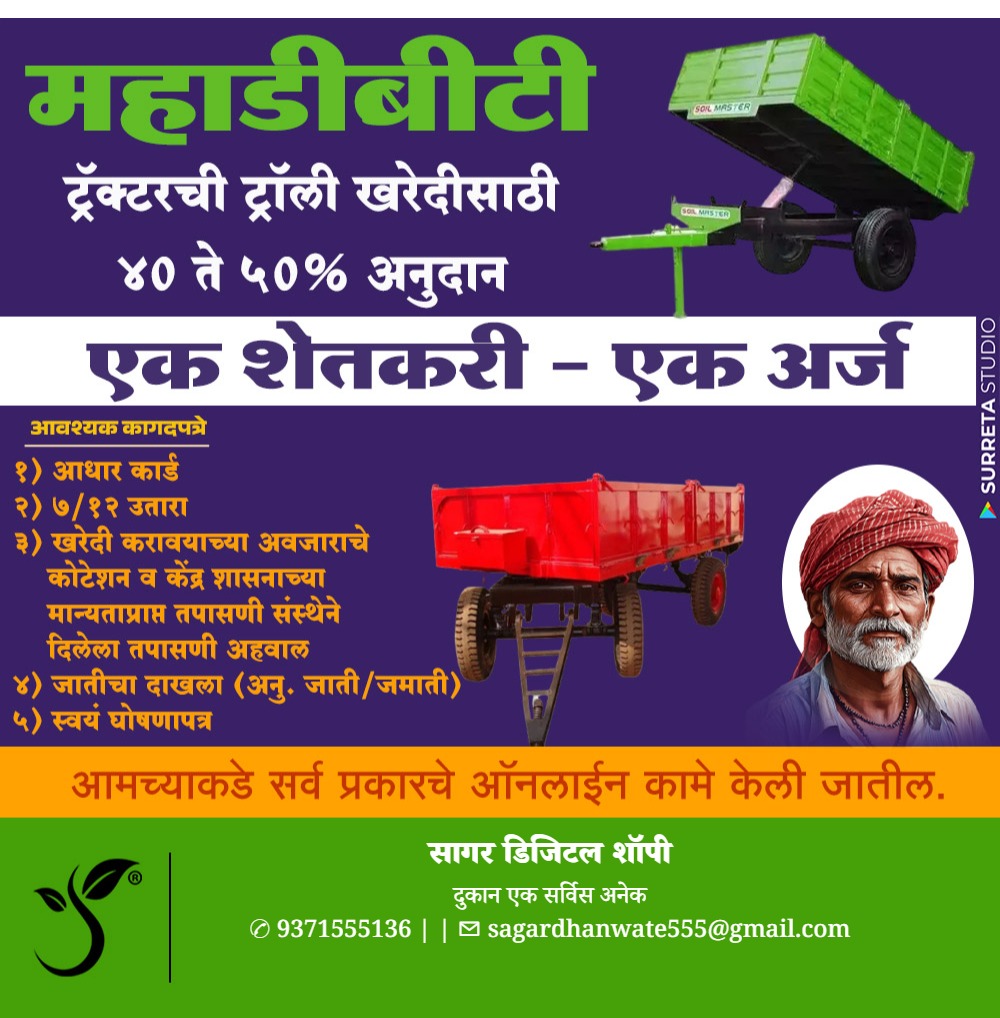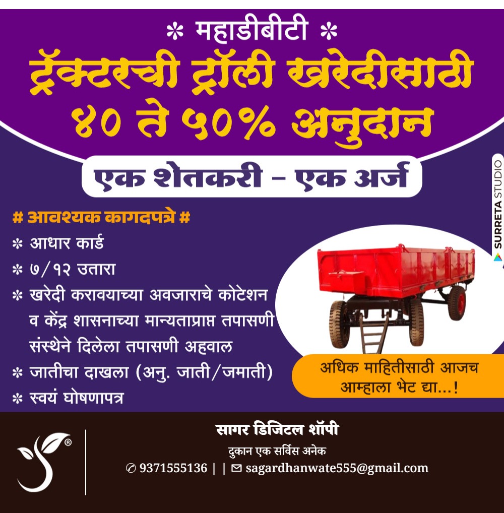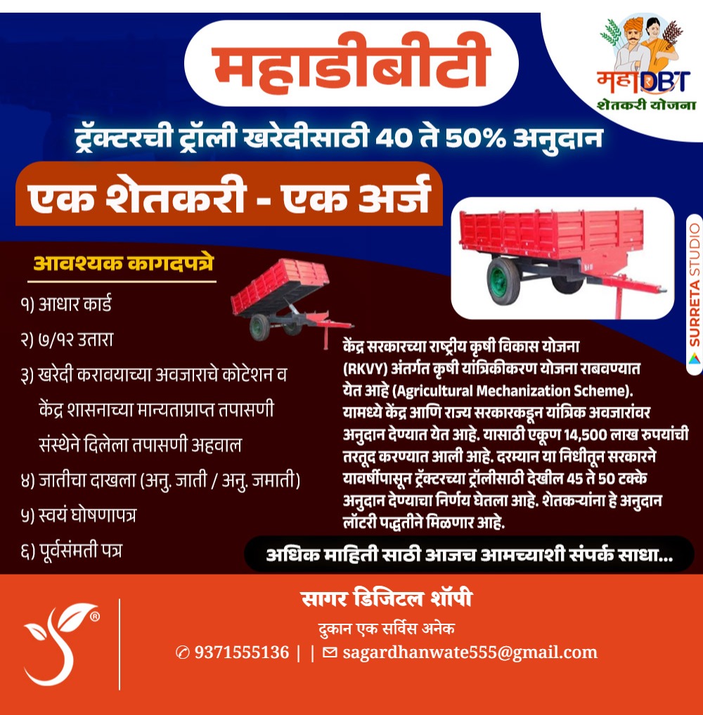✅ ट्रॅक्टर ट्रॉली खरेदीसाठी 40%–50% पर्यंत अनुदान 💰